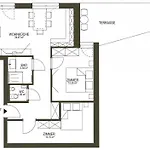The property comprises a storage space, a balcony, and a terrace featuring a sofa, and modern comforts like a TV. They are fitted with parquet flooring. The bathrooms feature a walk-in shower and a separate toilet.
